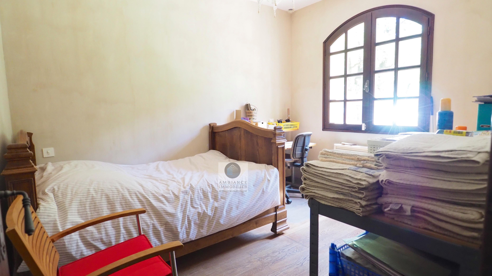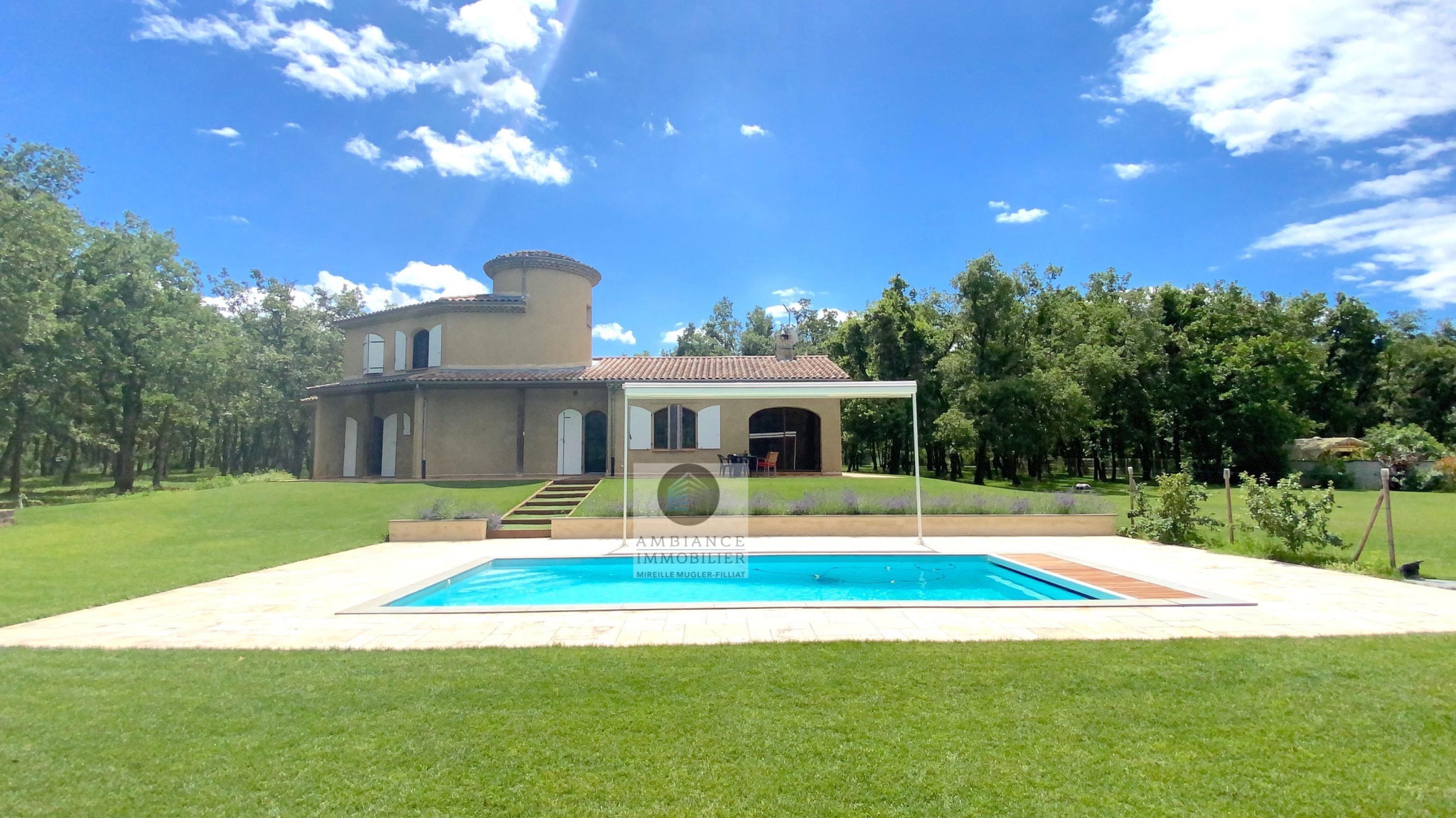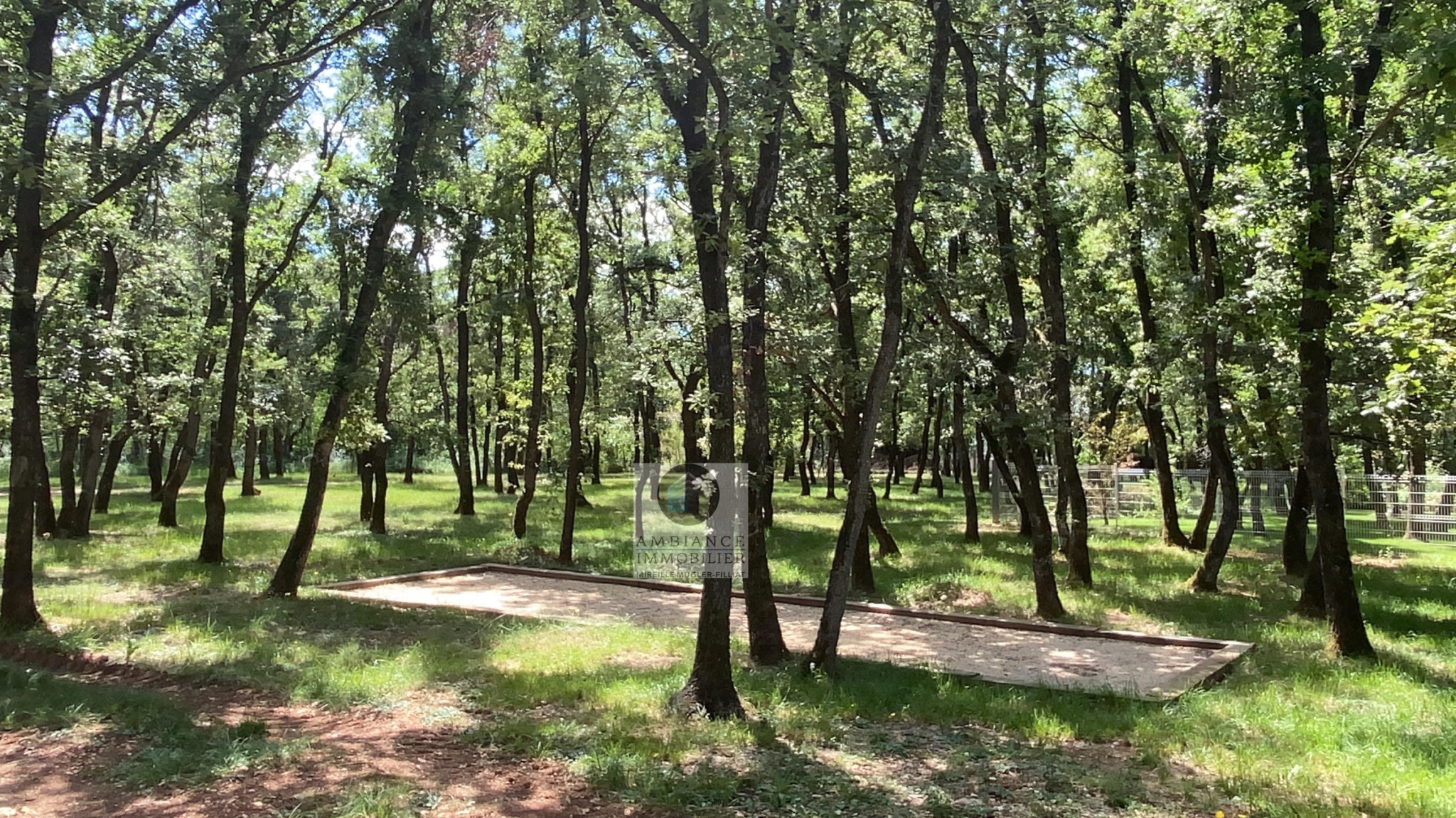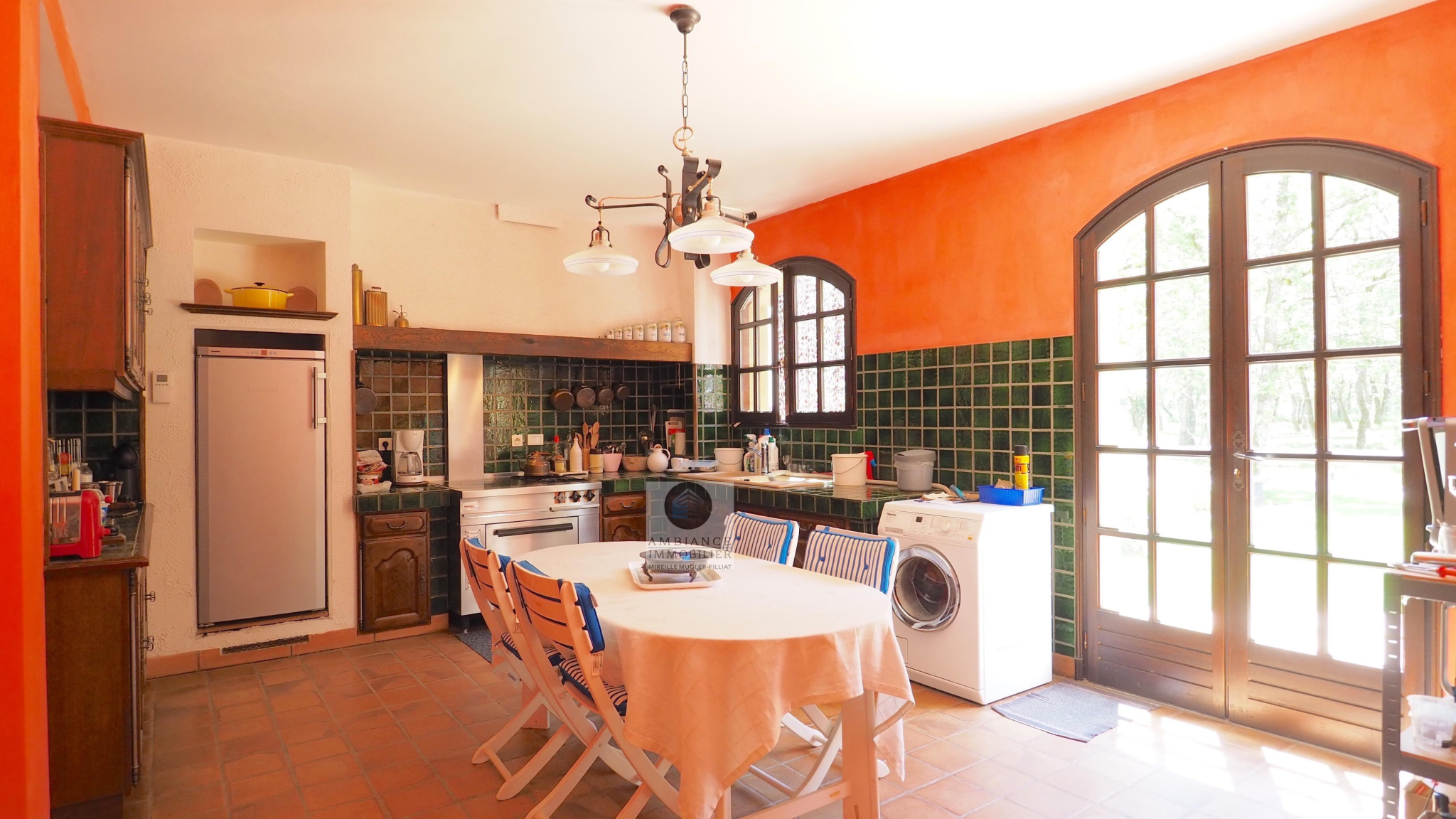 CHABEUIL en exclusivité, le calme, une belle exposition, une jolie vue sur le parc, un cadre enchanteur, une conception originale et de beaux volumes pour cette maison d’architecte de 160m2. Une pièce de vie de 46m2 avec salon-séjour de 31m2, salon TV de 15m2 avec cheminée à foyer fermé, cuisine dînatoire de 21m2, salle d’eau, 4 chambres dont 1 suite parentale de 24m2 avec salle de bains et terrasse avec véranda. Chauffage électrique, panneaux solaires pour la production d’eau chaude. Un sous-sol de 108m2 : garage de 92m2, cave et local technique. Parcelle de terrain de 1ha dont une grande partie boisée de chênes et environ 2 500m2 de pelouse, un espace détente autour d’une piscine de 9m x 4m sécurisée par un volet immergé, de belles ambiances de terrasses sud/est et ouest.