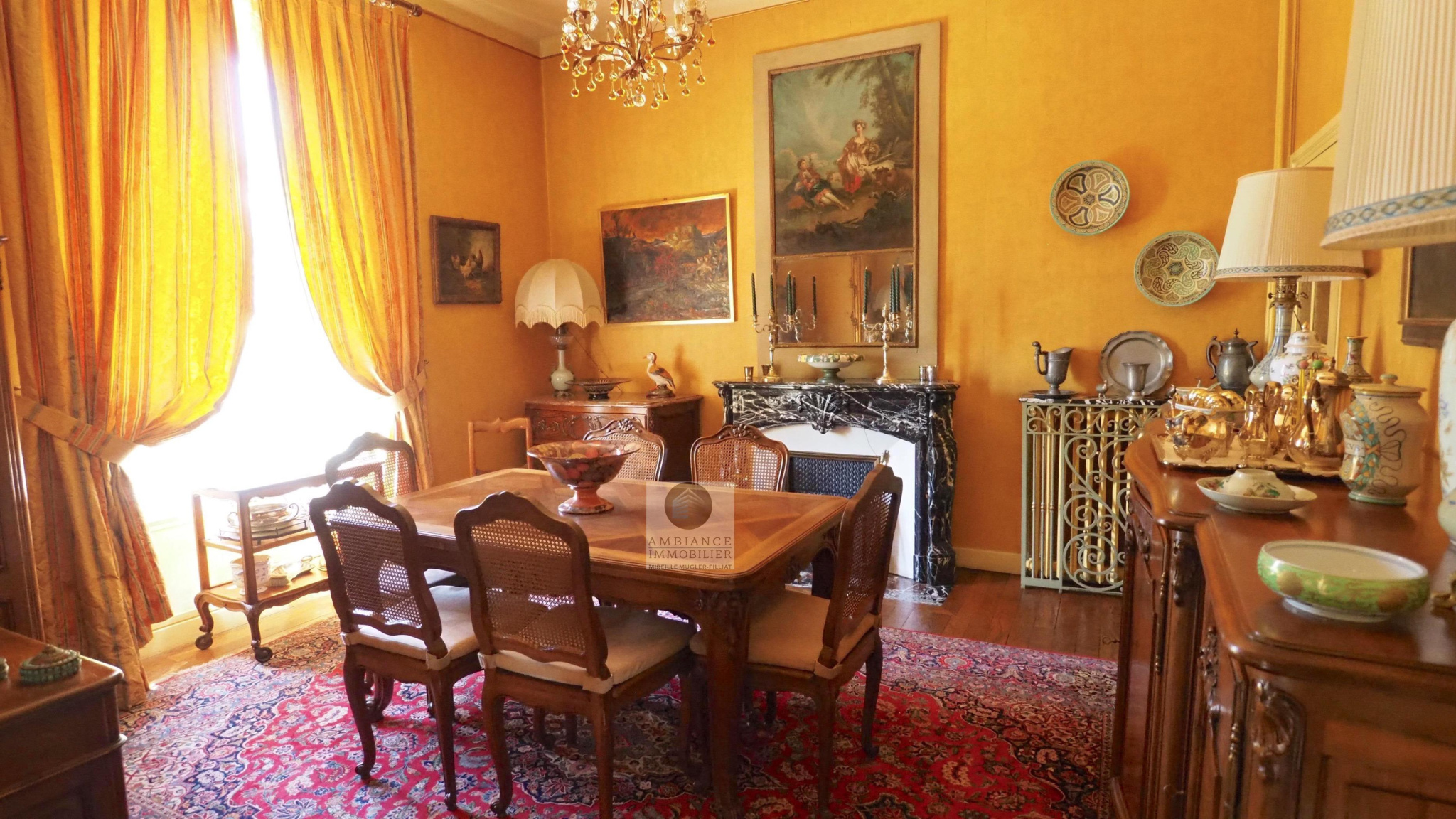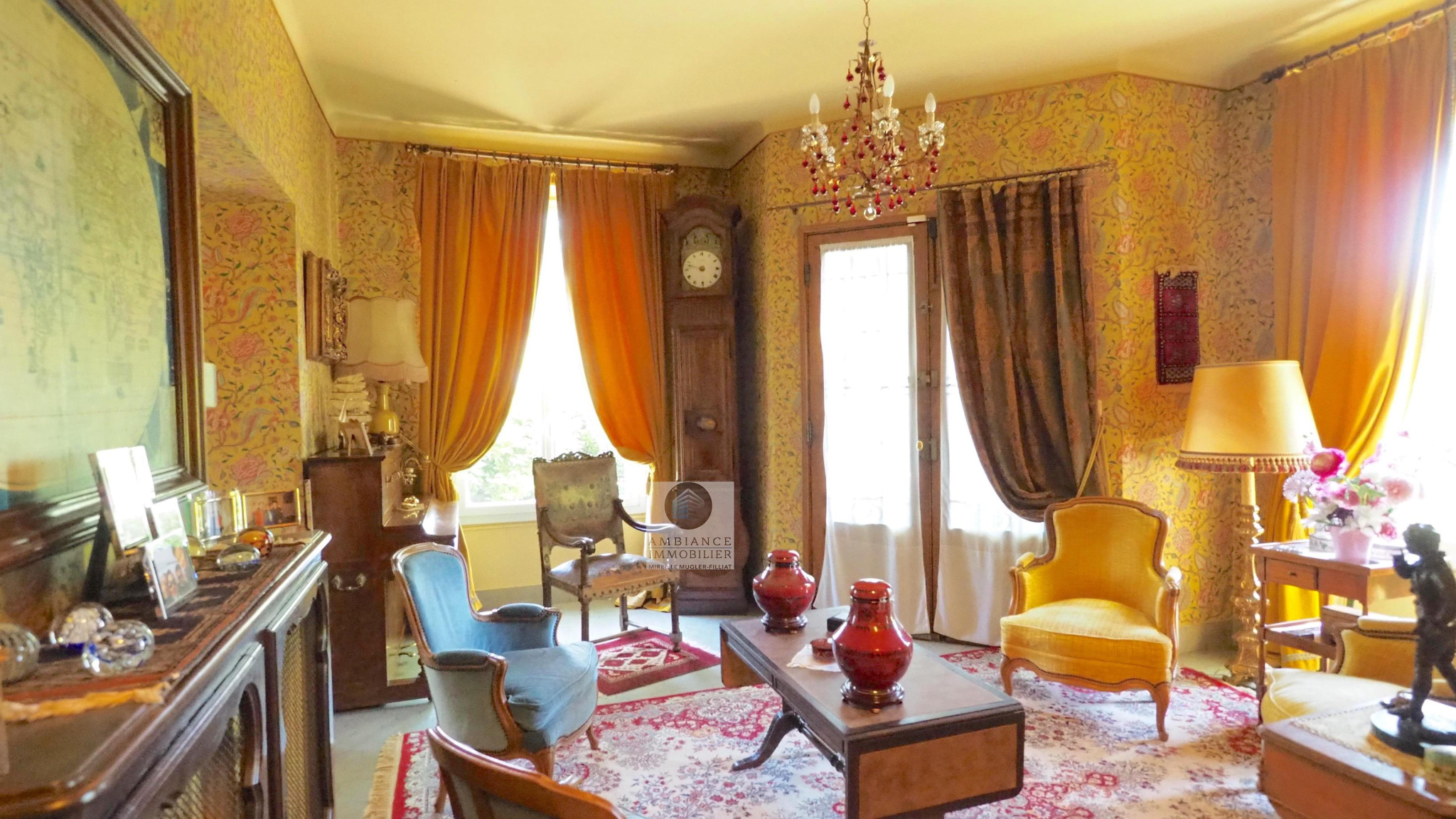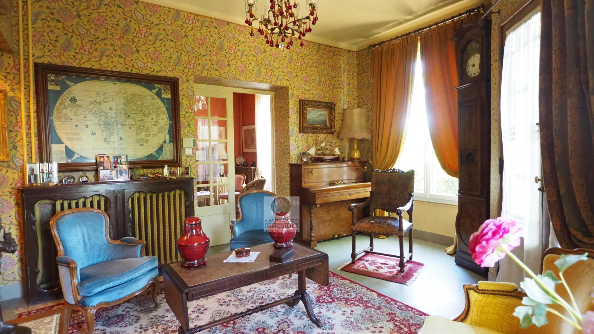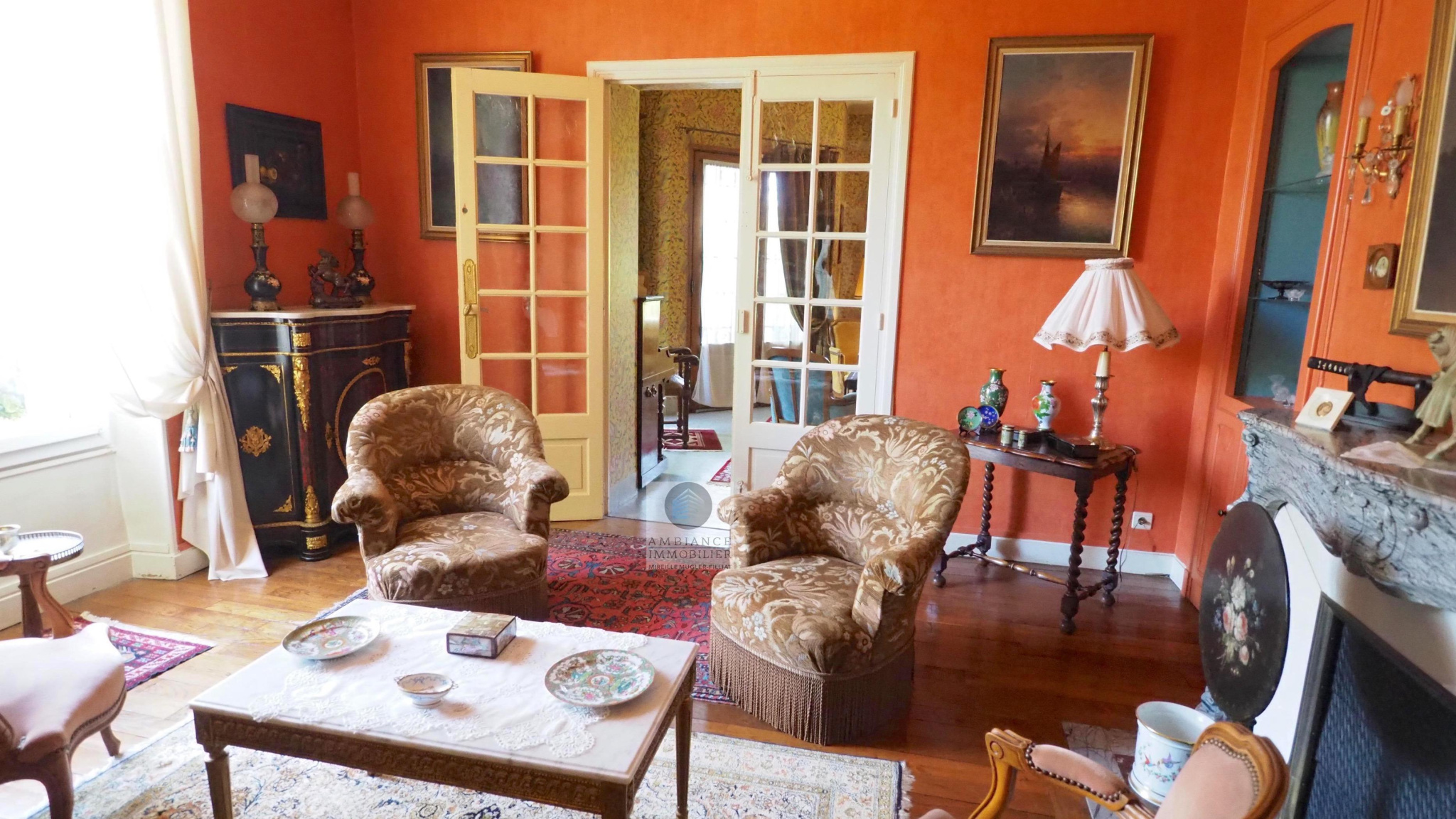 GUILHERAND-GRANGES en exclusivité, centre-ville, la luminosité, le charme de l’ancien avec de beaux parquets, des cheminées, de beaux volumes, une architecture originale, le caractère authentique préservé pour cette maison de caractère de 1890 de 222m2. Cuisine dînatoire de 22m2 avec accès au jardin, séjour, 2 salons de réception, de belles portes vitrées offrant une belle perspective sur les 50 m2 de pièces de vie. Au 1er étage un salon TV/bibliothèque de 25m2 avec un bow-window, 1 bureau, 5 chambres dont 1 chambre d’amis avec un coin toilette, salle de bains avec baignoire et vasque. Grenier, petit garage/atelier et 50m2 de caves. Chauffage par pompe à chaleur de 2017, climatisation, huisseries pvc. Alarme. Puits. Parcelle de 790m2 avec jardin paysager et parkings.