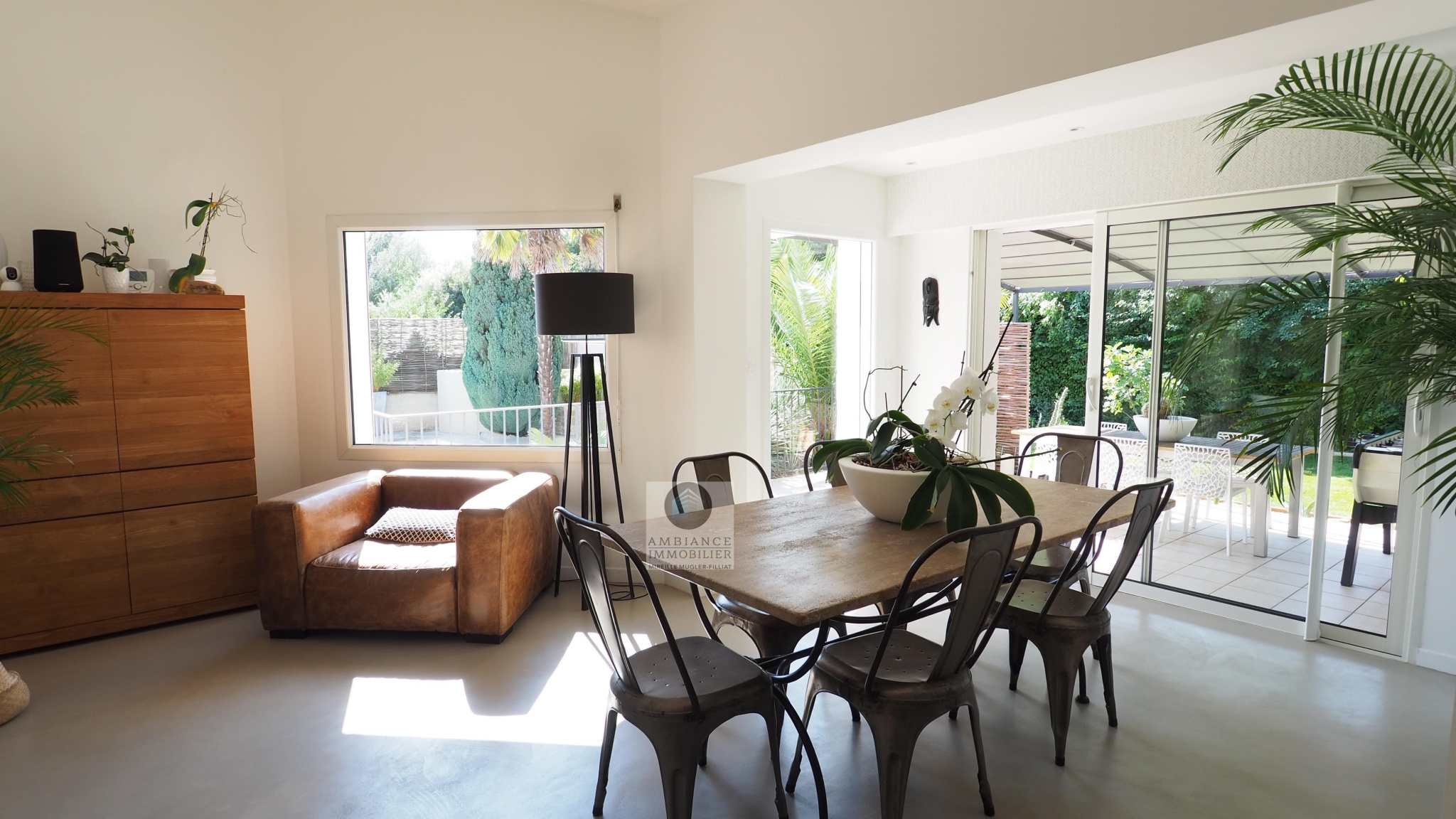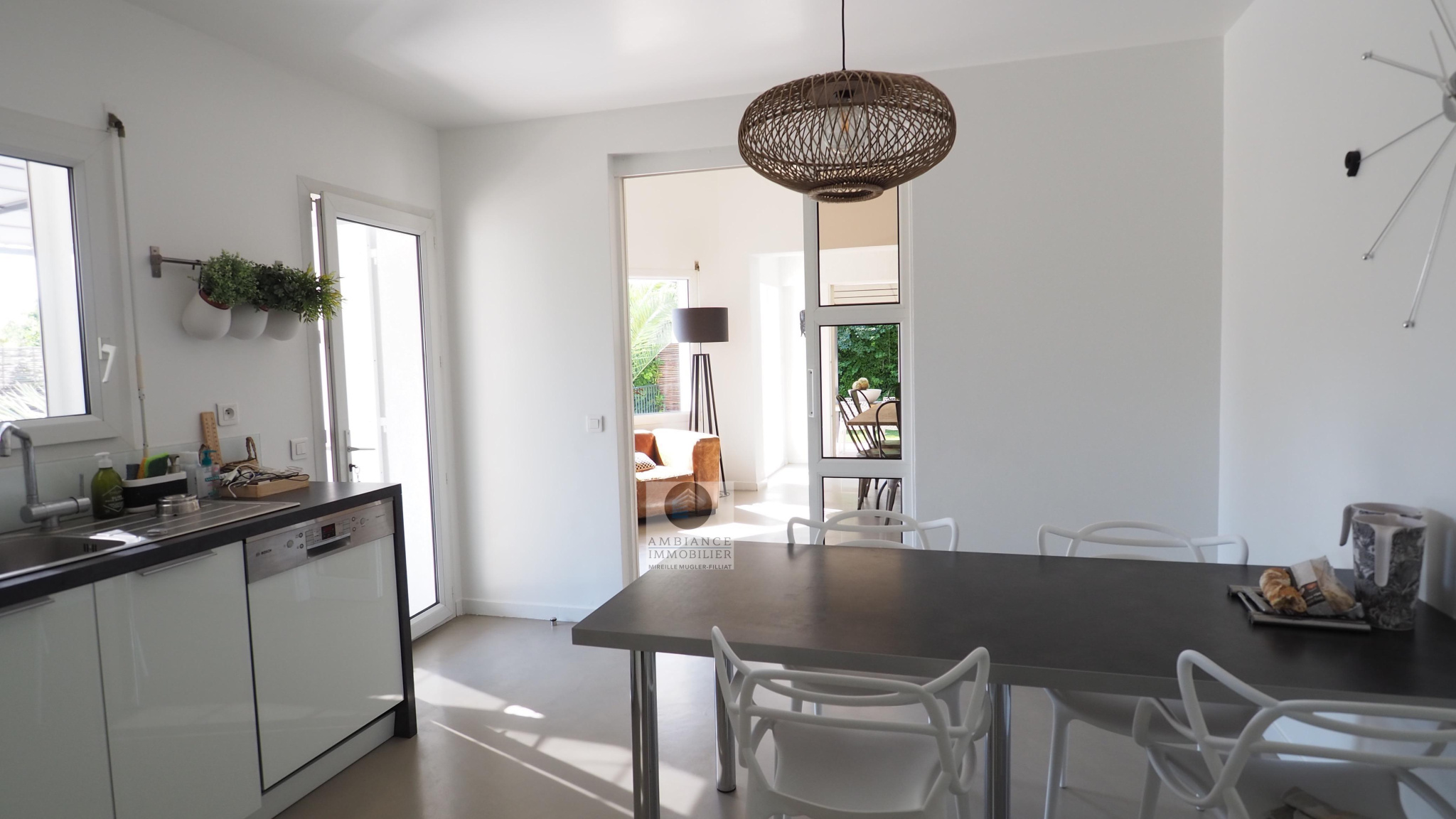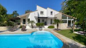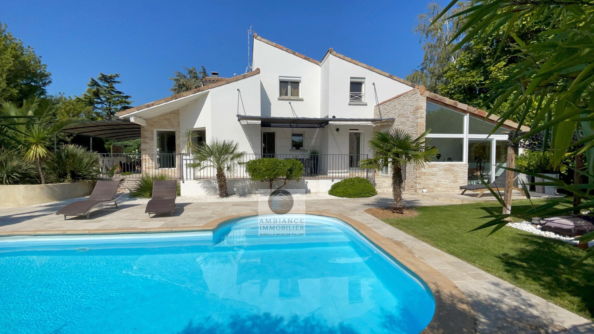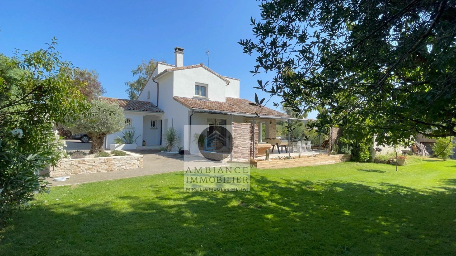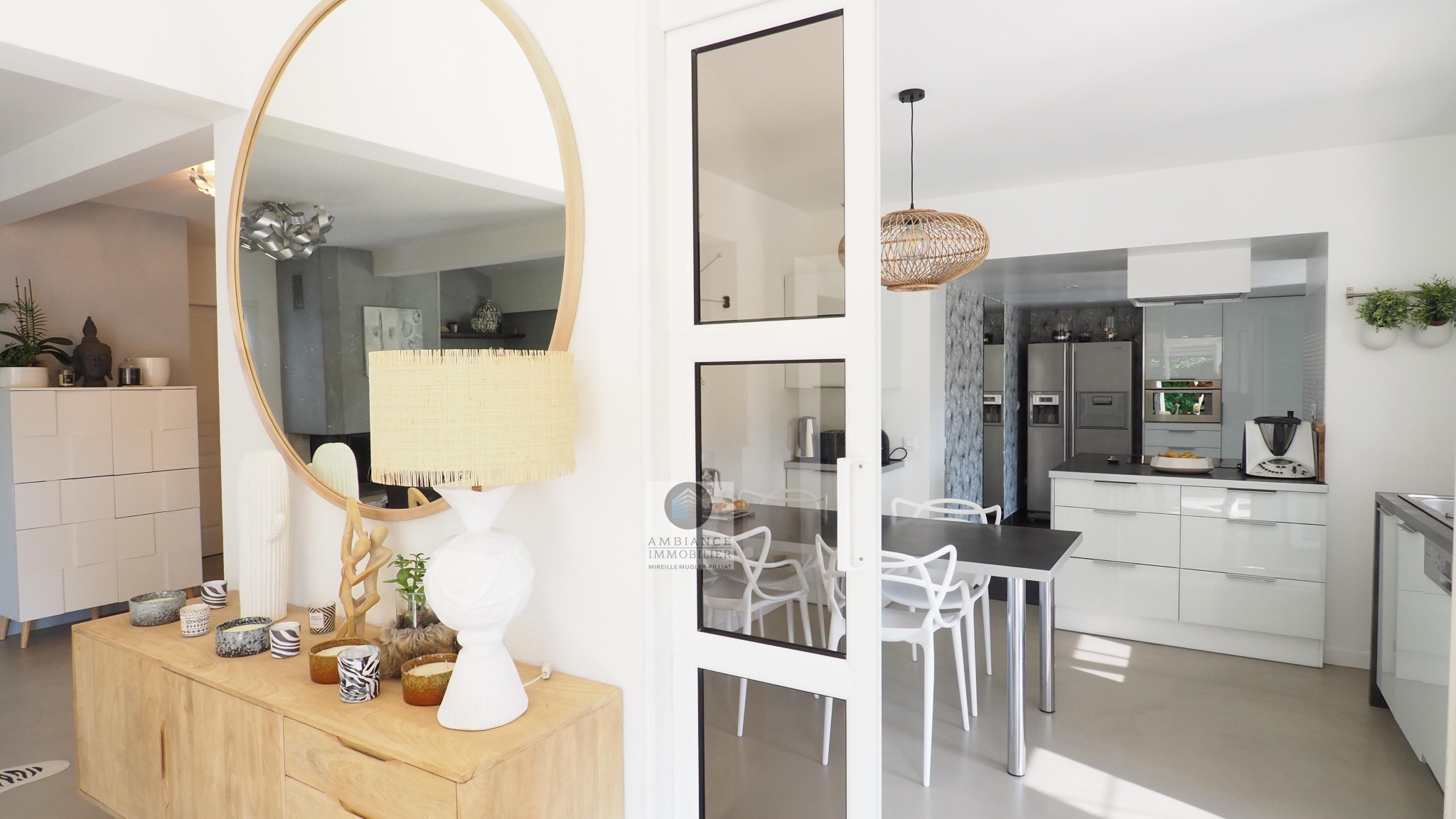 GUILHERAND-GRANGES, en exclusivité, dans quartier résidentiel, le calme, la luminosité, une belle exposition, une architecture originale, de grandes baies vitrées offrant de belles perspectives sur le jardin joliment paysager et de spacieuses terrasses avec pergolas. Un esprit contemporain et une ambiance chaleureuse pour cette maison de 206m2. Une enfilade de pièces de vie de 100m2 : salon-séjour de 55m2, salon TV de 19m2, cuisine intégrée de 26m2, 5 chambres dont 1 suite parentale au rdc de 18m2 avec salle d’eau et dressing. Au 1er étage : 4 chambres et 1 salle de bains. Salle de sport ou bureau avec accès indépendant. Chauffage au gaz par le sol et radiateurs, climatisation. Garage de 38m2,parking fermé. Terrain de 1 117m2 avec un bel espace détente autour d’une piscine sécurisée de 8m x 4m, un jardin aménagé dans un esprit sud – arrosage intégré avec l’eau du puits. Vous serez séduits par le charme et la douceur de vivre de cette maison.