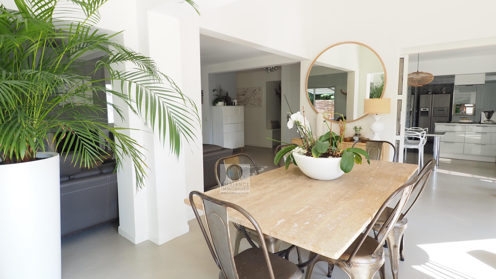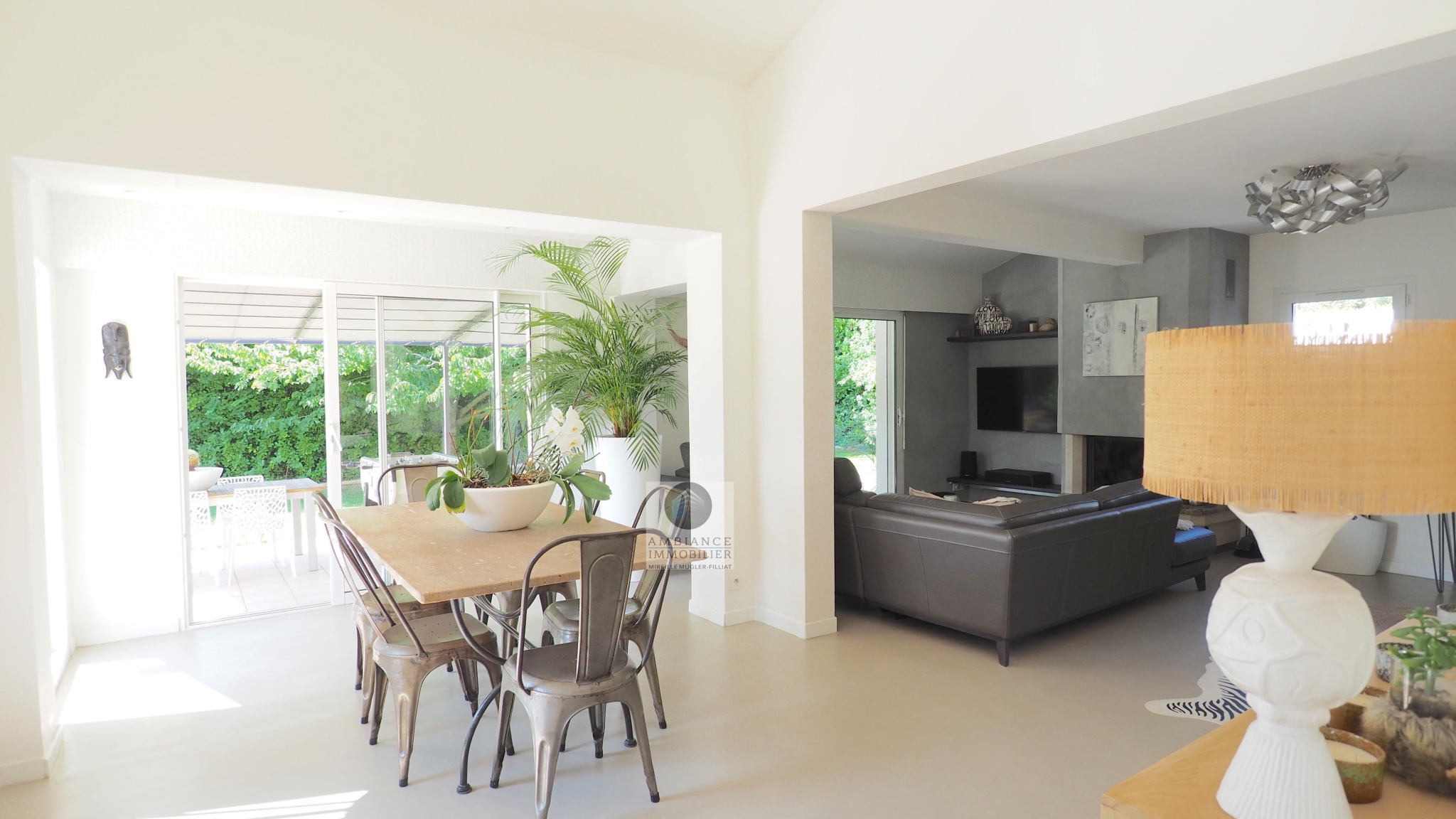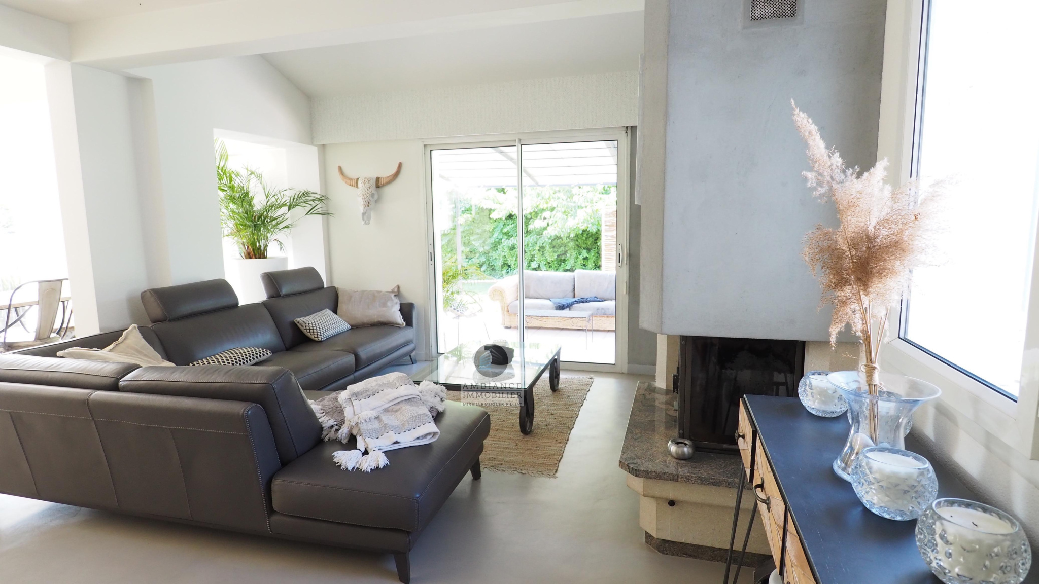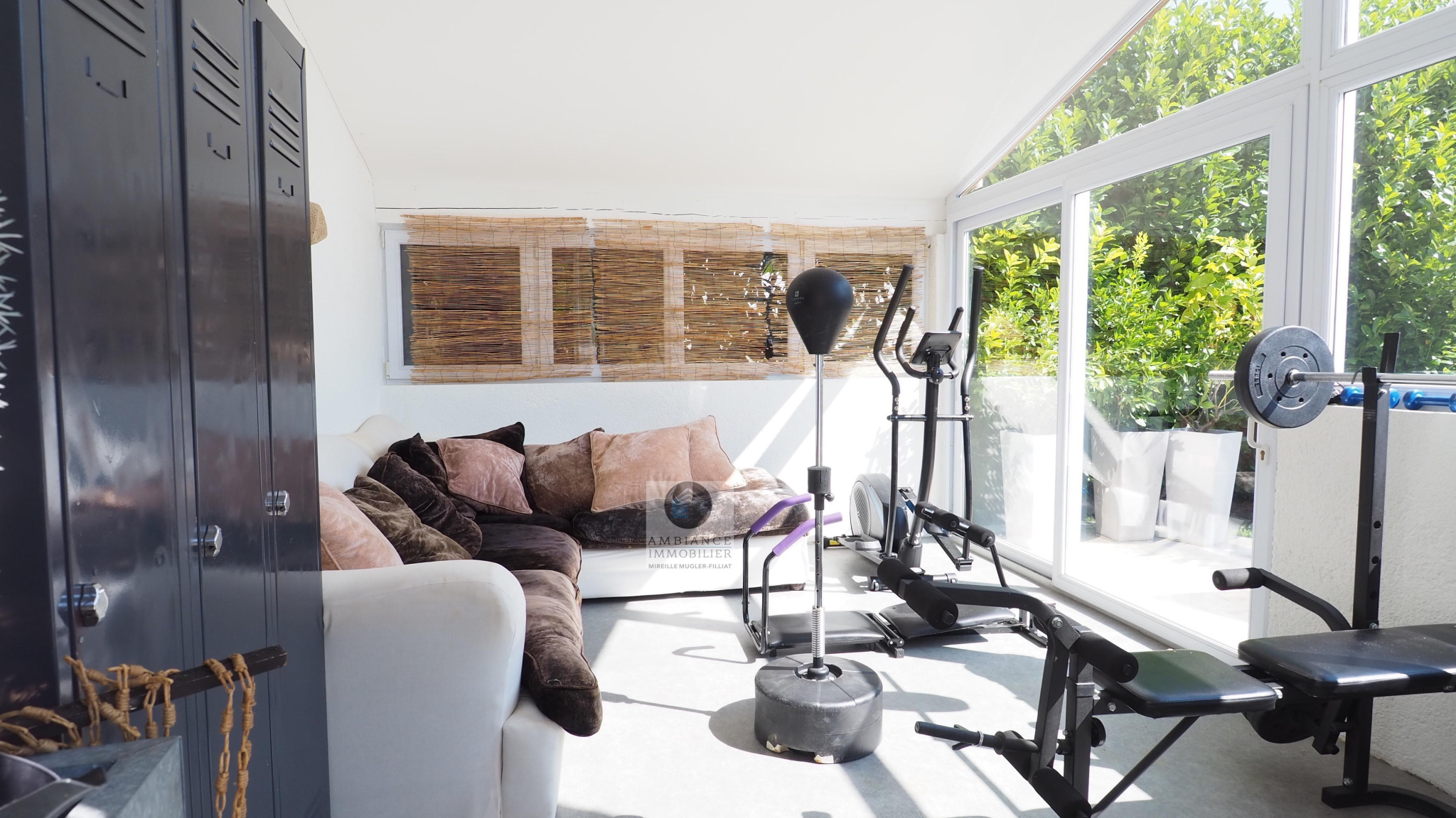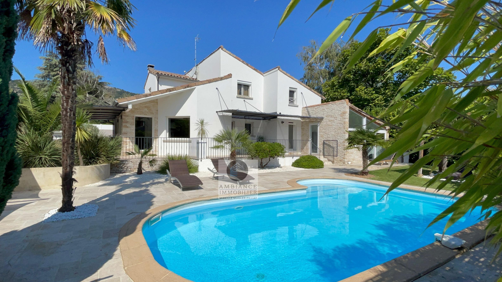 GUILHERAND-GRANGES, en exclusivité, dans quartier résidentiel, le calme, la luminosité, une belle exposition, une architecture originale, de grandes baies vitrées offrant de belles perspectives sur le jardin joliment paysager et de spacieuses terrasses avec pergolas. Un esprit contemporain et une ambiance chaleureuse pour cette maison de 206m2. Une enfilade de pièces de vie de 100m2 : salon-séjour de 55m2, salon TV de 19m2, cuisine intégrée de 26m2, 5 chambres dont 1 suite parentale au rdc de 18m2 avec salle d’eau et dressing. Au 1er étage : 4 chambres et 1 salle de bains. Salle de sport ou bureau avec accès indépendant. Chauffage au gaz par le sol et radiateurs, climatisation. Garage de 38m2,parking fermé. Terrain de 1 117m2 avec un bel espace détente autour d’une piscine sécurisée de 8m x 4m, un jardin aménagé dans un esprit sud – arrosage intégré avec l’eau du puits. Vous serez séduits par le charme et la douceur de vivre de cette maison.